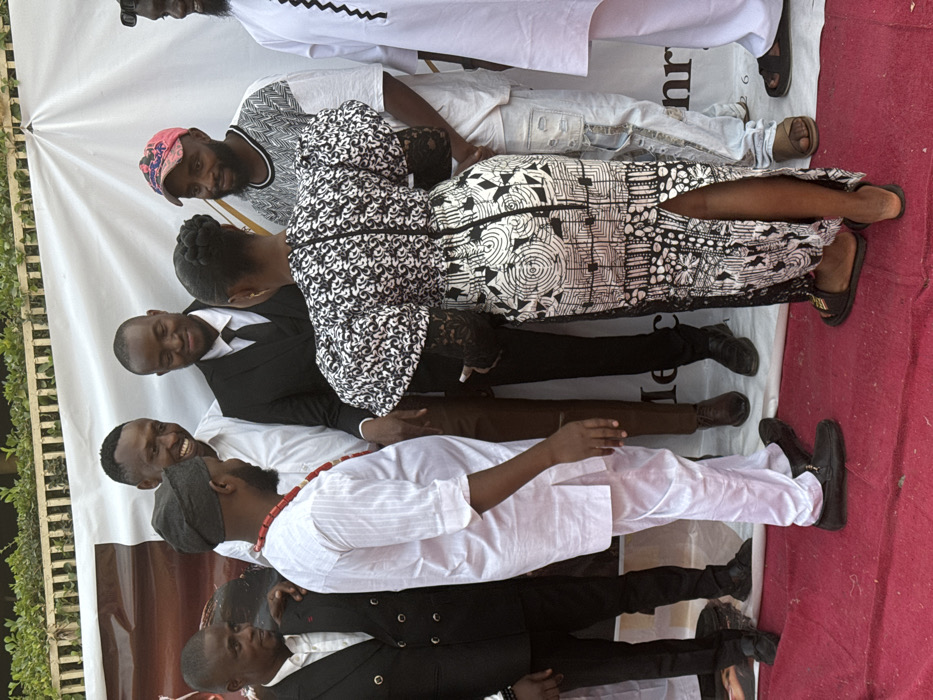 Seven individuals, predominantly male, are positioned on a red carpet in an outdoor setting, facing inward towards the center of the group. The specific location within Jos, Nigeria, is not identifiable from the image. A woman, seen from behind at the center-right, wears a black and white patterned dress with voluminous puffed sleeves and black lace detailing on the lower sleeves. Her hair is styled in a neat bun, and she wears black open-toed sandals. To her left, a man wears a white native attire with vertical stripes, a black cap, and a prominent red beaded necklace. He has a beard and is looking towards the woman. He wears black loafers. To the far left, a man in a black double-breasted suit and white shirt smiles, looking towards the center. Immediately to his right, another man in a white collared shirt and brown trousers smiles broadly. To the right of the woman, a man in a black suit, white shirt, and black tie stands, smiling subtly. Next to him, a man in a white short-sleeved top with a black and white abstract pattern, ripped light-blue jeans, and a red and white baseball cap smiles. Partially visible at the far right is another man in white native attire with black embroidery and a dark cap. The group appears engaged in an informal interaction, with several individuals smiling. The red carpet extends across the foreground. In the background, a large white banner or backdrop displays partial black text including "Me" and "nri", along with a gold graphic. Above the banner, green foliage and a light-colored fence or railing are visible. The scene is illuminated by natural daylight.