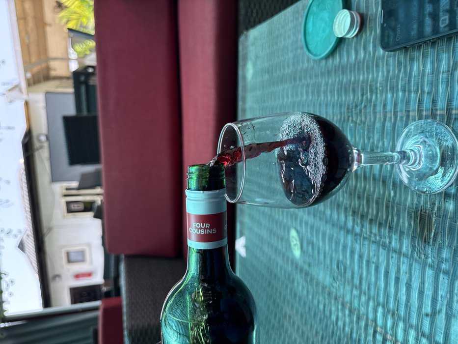 - "Red wine is actively pouring from a green bottle labeled "FOUR COUSINS" into a clear stemmed wine glass positioned on a teal woven outdoor table" by FM-ddIDX2, licensed under CC BY 4.0