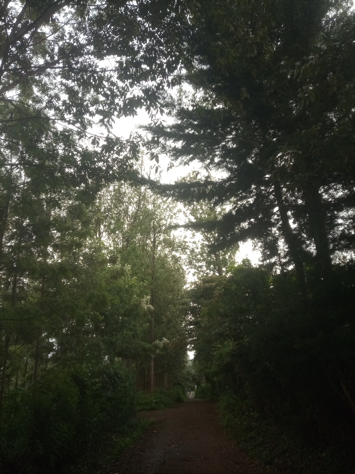 The image displays an unpaved, dark brown path extending through a densely wooded environment