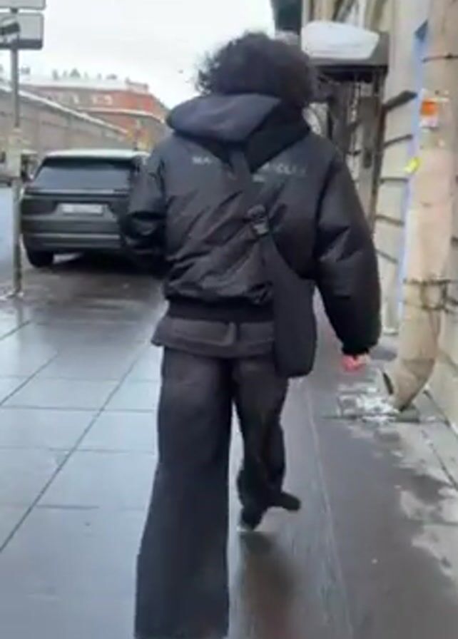 A person with curly hair walks away from the camera on a sidewalk in an urban environment on an overcast day. The person is wearing a black jacket with visible lettering, black wide-leg pants, and black shoes. They have a black bag slung across their body. The sidewalk is wet, reflecting the sky. Behind the person, there are cars parked along the street. Two people, a man and a woman, are walking in the opposite direction. There are buildings on either side of the street. A parking sign is visible at the start of the video.