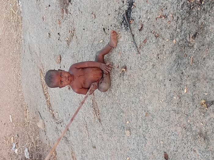 A young, possibly malnourished child sits on a dirt surface with sparse vegetation. The child looks up at the camera, with dark skin and a bare chest. One leg is stretched out to the side while the other is bent. A thin stick extends from the bottom of the frame towards the child. Scattered debris and dry leaves are visible on the ground around the child. The scene appears to be in a rural or impoverished setting.