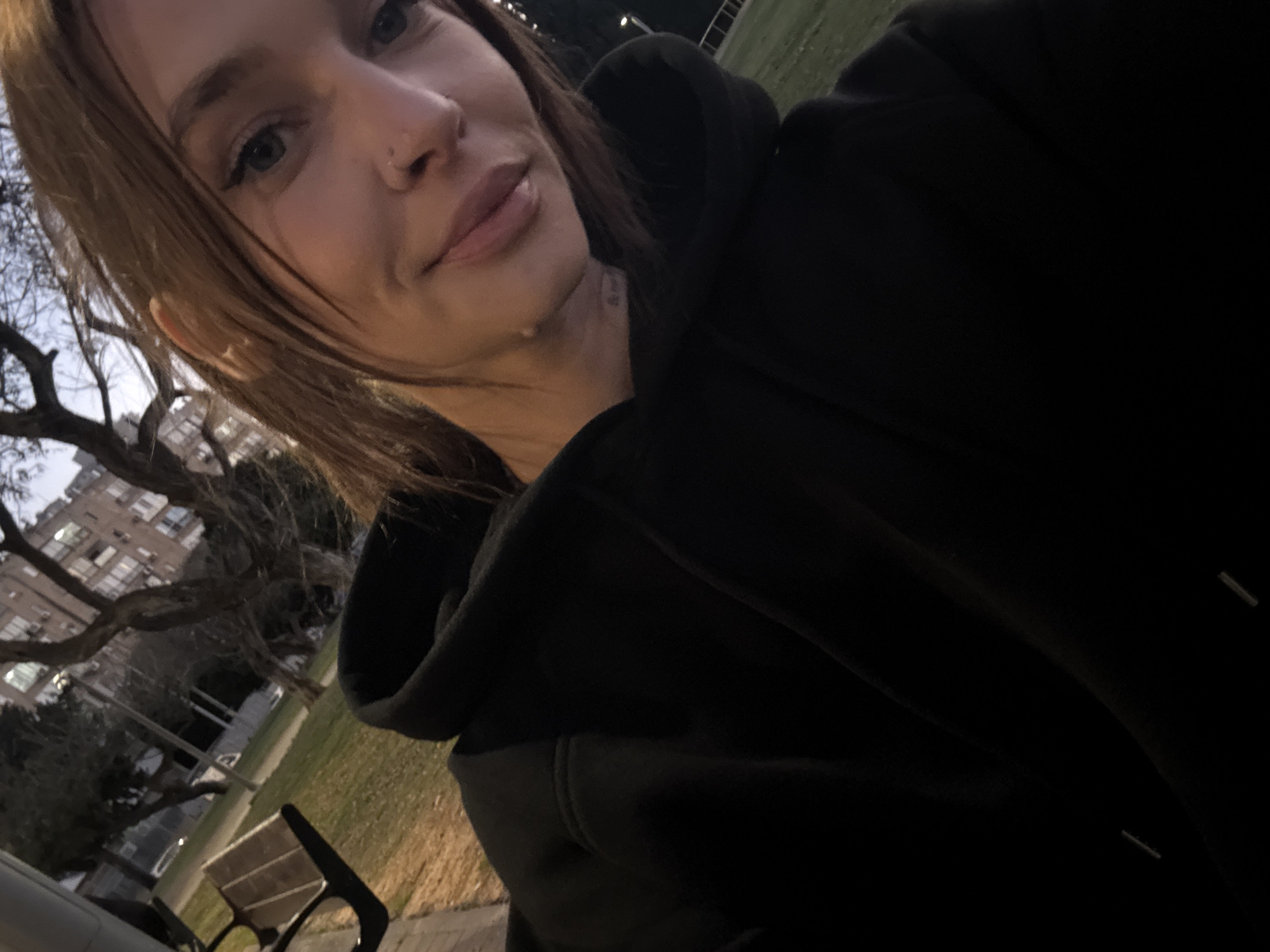 A close-up shot shows a fair-skinned person wearing a dark hooded sweatshirt. The background features a park-like area, a building with multiple windows, and a bare tree. A bench is visible to the left. The location is Bat Yam, Israel.
