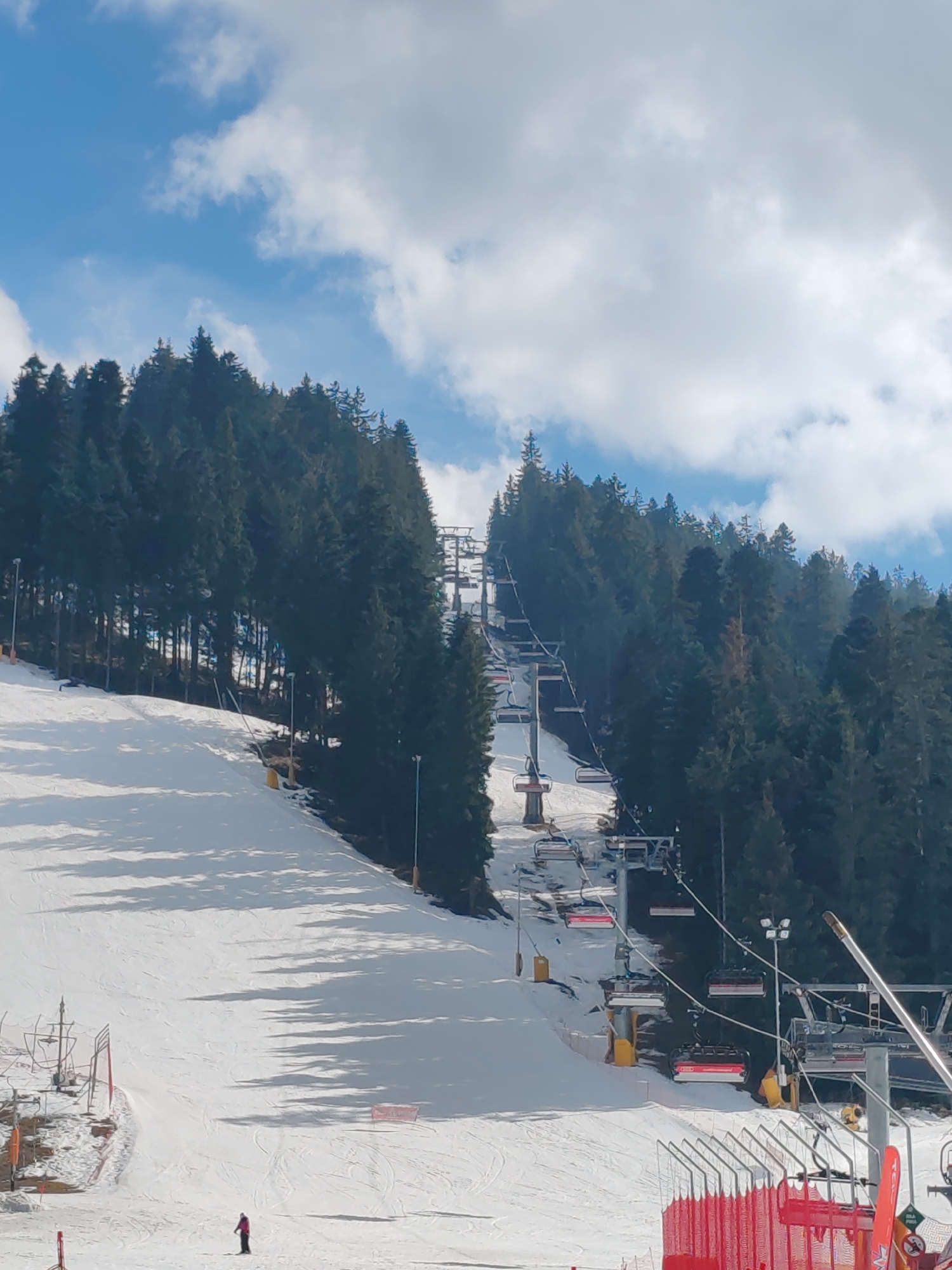 The image displays a snow-covered ski slope at the Borovets ski resort, located near Samokov, Bulgaria, under a sky with scattered white clouds and patches of clear blue. A multi-chair ski lift system runs centrally up the mountain, flanked on both sides by dense coniferous forests. The foreground features a wide, groomed ski run with visible ski tracks and shadows cast across the snow. One individual, wearing a dark pink jacket and dark pants, is observed standing on skis on the lower left section of the slope. At the bottom right, a ski lift loading area is marked by red safety netting and metal support structures. Multiple empty chairs with red seats are visible on the ascending ski lift. Tall poles with light fixtures are positioned along the perimeter of the slope, accompanied by smaller yellow marker poles. A snow-making cannon is partially visible near the base of the lift on the right.