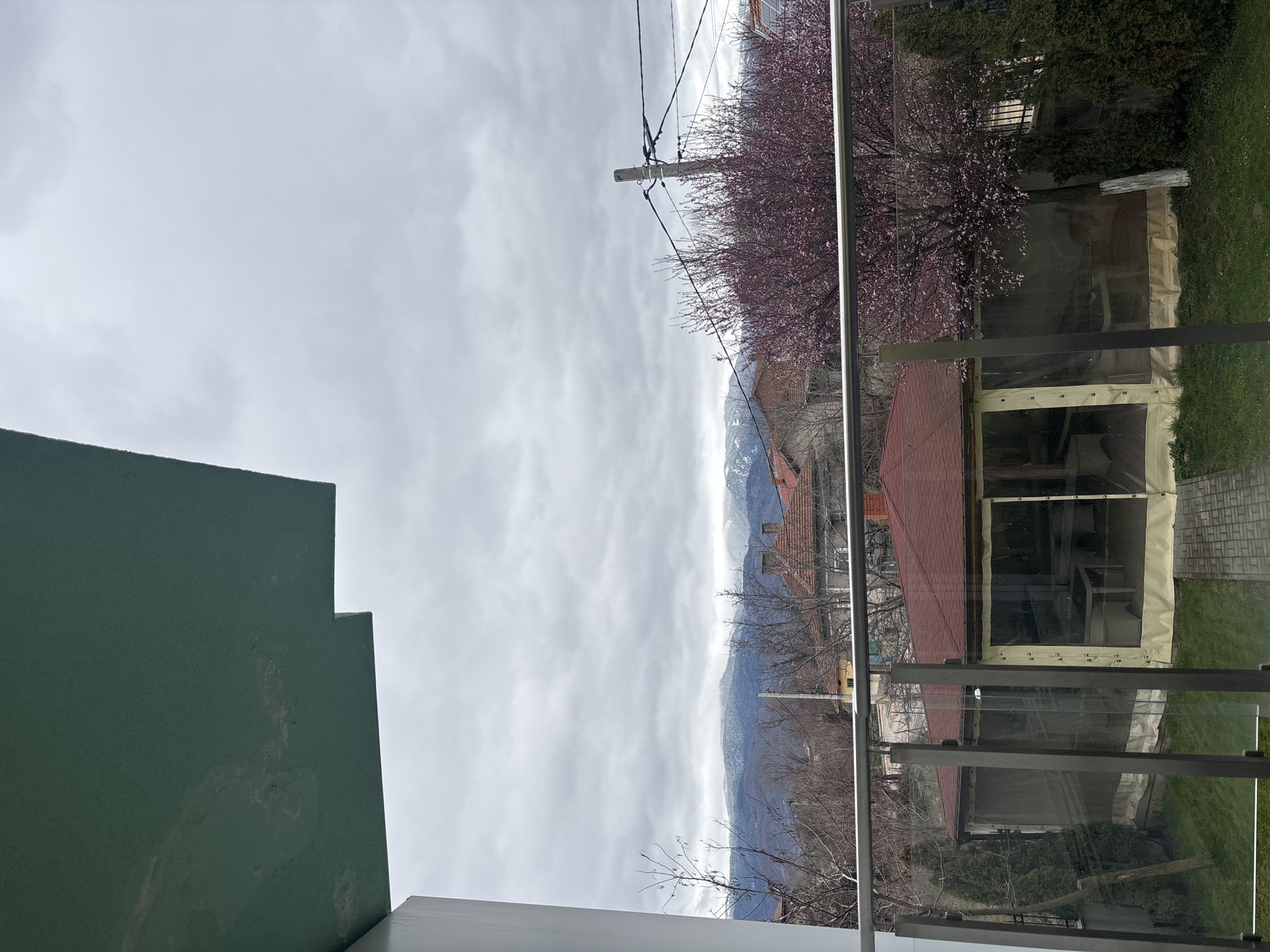 View from an elevated position in Dolna Banya, Bulgaria, likely a balcony or window, overlooking a landscape of buildings, vegetation, and distant mountains. Sky is overcast. A green wall is visible on the left side. Power lines and a utility pole are visible. A tree with pink blossoms is in the right foreground. Some snow is visible on the mountain tops. A structure with a transparent enclosure sits on a lawn, visible through a glass railing. A red-tiled roof is visible in the middle ground.