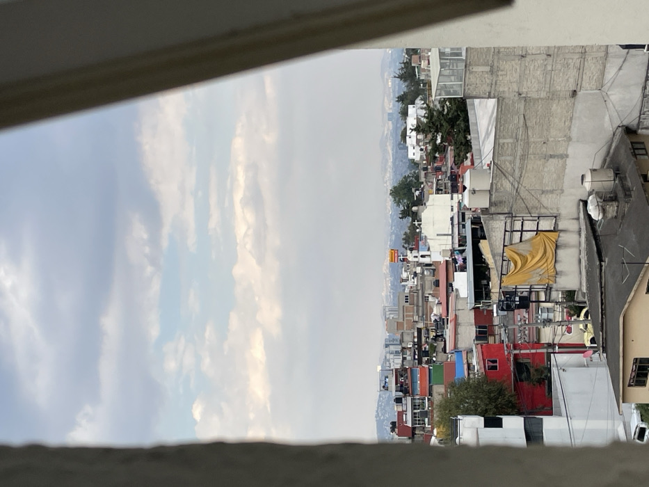 An urban landscape view is divided into two halves. The left side features a cloudy sky with varying shades of gray and white. The right side is densely packed with buildings of various heights and colors, dominated by light gray and white structures. Some buildings have rooftop features like water tanks and clotheslines. A treeline can be seen amidst the buildings, with a distant horizon visible in the background. The view is framed by a partial view of a window frame in the foreground.