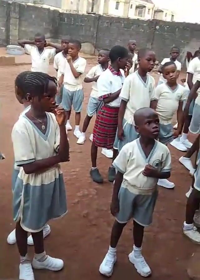 A group of children, mostly dressed in matching uniforms of light-colored tops and blue or plaid bottoms, stand in an outdoor area
