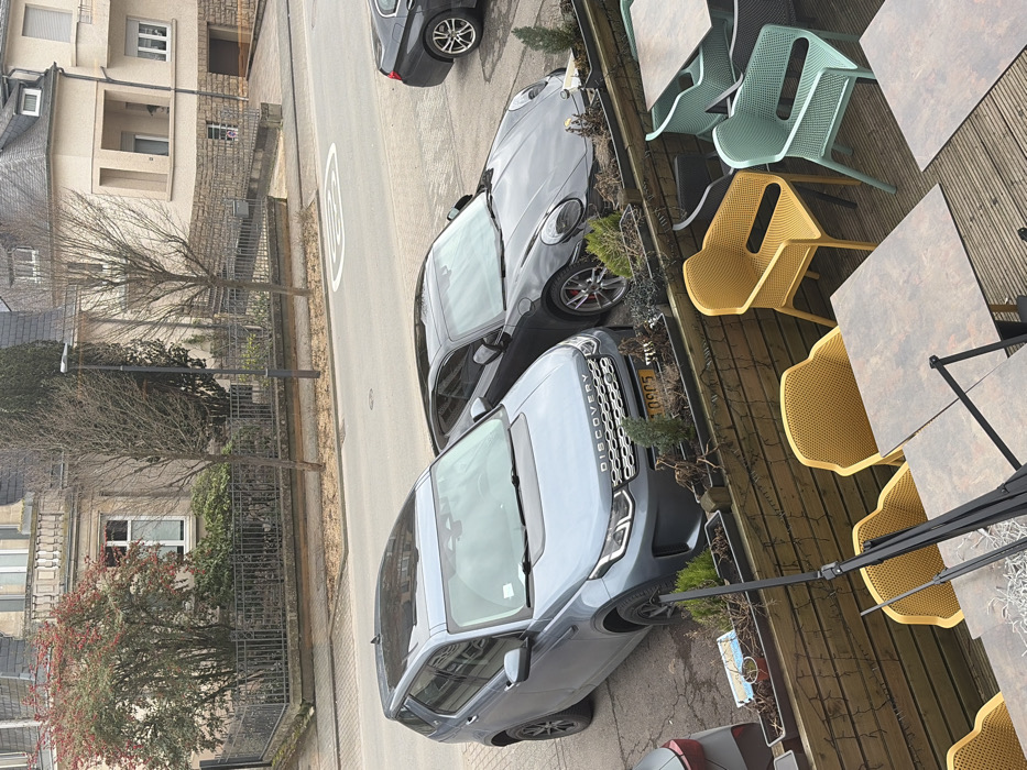 This image depicts a static street scene in Walferdange, Luxembourg, observed from an elevated position, likely a cafe or restaurant terrace. In the foreground, a multi-colored outdoor dining area features wooden decking, several dark-topped tables with black bases, and numerous plastic chairs in yellow, light green, and dark grey. A rectangular wooden planter box, containing mostly dormant or dead plants interspersed with small evergreen shrubs, runs along the terrace's edge. A black metal support structure, possibly for an awning, extends upwards on the left. Immediately beyond the terrace, on a paved surface, a grey Land Rover Discovery SUV (license plate D 09 C5, Luxembourgish registration) is parked facing slightly left. Behind it, a dark grey or black Porsche 911 coupe, identifiable by its distinctive headlights and red brake calipers, is parked. The rear section and a single wheel of a third dark-colored vehicle, possibly a BMW, are visible on the far right, further down the street. The vehicles are parked alongside a narrow asphalt street that features a prominent white "30" speed limit marking painted on its surface. A paved sidewalk runs parallel to the street. In the background, across the street, stand several multi-story buildings. An older structure on the left features a light-colored facade with intricate window details and a prominent bush adorned with red berries in front of a metal fence. To its right, a more contemporary building with a beige/cream facade and a sloped roof is visible. Bare deciduous trees, along with some evergreen shrubs, line the street and properties. A single streetlamp is visible on the left side of the street. The sky is overcast, indicating a cloudy day. No individuals are present in the image.