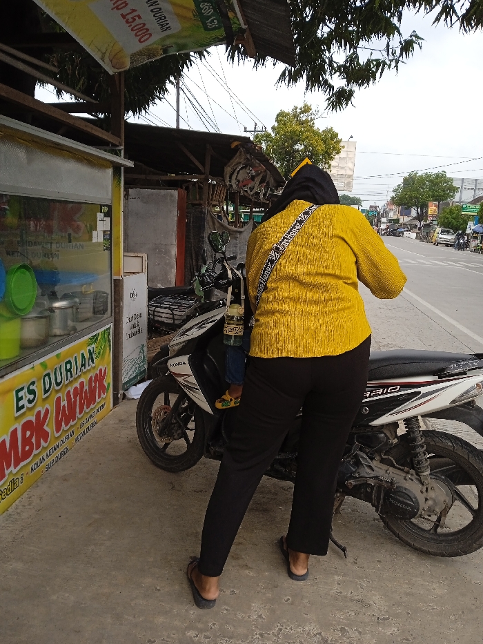 The image displays a roadside scene in Sarimulyo, Indonesia. An adult, viewed from the back, occupies the central foreground. This individual wears a yellow textured long-sleeved top, black trousers, and black flip-flops. A black head covering is visible, and a black and white patterned shoulder bag, featuring "Miss Honey" text, crosses their back diagonally. They stand on a concrete surface next to a white and black Honda Vario scooter. A small child, wearing blue pants and yellow sandals, is seated on the scooter's front portion, facing away from the camera. A transparent bottle hangs from the scooter's handlebars near the child. To the immediate left, a roadside food stall is visible, featuring a prominent yellow sign with red and black text reading "ES DURIAN MBK WIWIK," along with other menu items like "ENDUWET DURIAN" and "KETAN DURIAN," and pricing, including "Rp 15.000." The stall structure includes a glass display case containing green-lidded containers and metal pots. In the background, a two-lane asphalt road with a white solid line is visible, stretching into the distance where more buildings, stalls, and green trees are present under a bright sky with overhead utility lines.