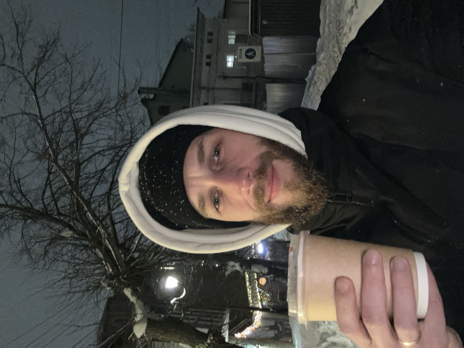 A selfie of a man with a beard wearing a white-hooded sweatshirt and black jacket. He is holding a beverage in a brown paper cup with a white lid. Snowflakes are visible on his black beanie. A bare tree and a building with lit windows stand in the background. Christmas lights adorn the fence. The picture is taken outside at night, possibly in winter. Snow can be seen on the ground.