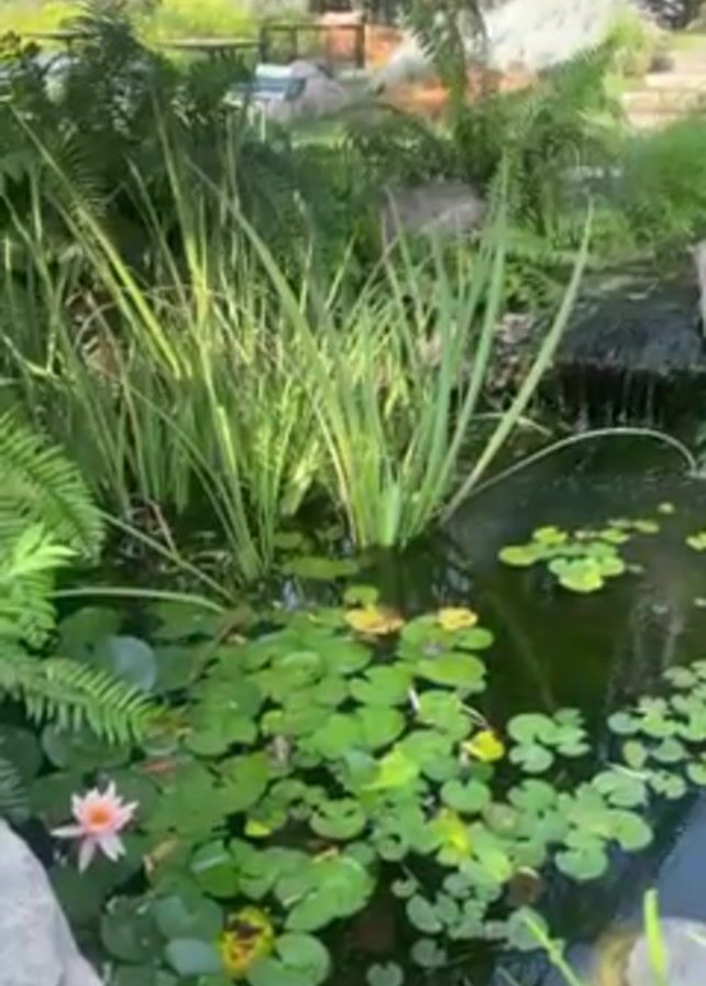 pond with lily pads, tall green plants, ferns, and a waterfall. A pink water lily is visible on the lower left. Behind the pond, a sitting area is visible. There is audio of people talking in the background.