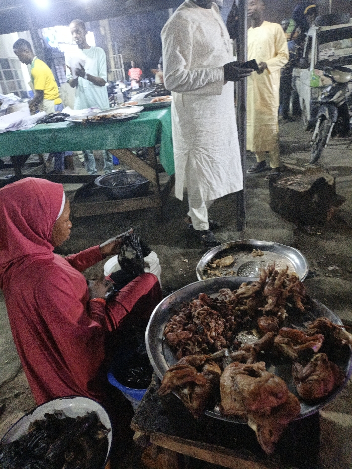 A woman in a red hijab sits preparing food at a street vendor stand. She is packing something into a black bag. Nearby are large metal trays with fried chicken pieces and other fried foods. There is also a white bowl filled with smaller, dark fried snacks. Several men stand in the background, including one in a long white robe and another in yellow. A motorcycle is parked at the right. The scene appears to be at night under dim lighting.