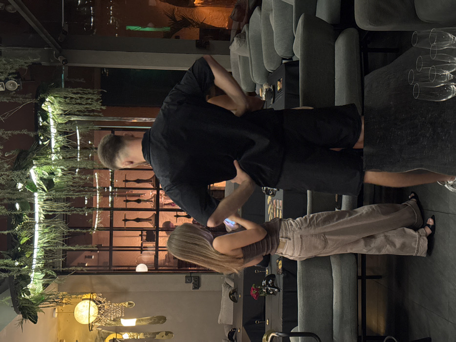 This image depicts an interior scene within a restaurant or lounge in Tibubeneng, Indonesia, characterized by dim, warm lighting and contemporary decor. Two individuals are present in the foreground. On the left, a female with long, light brown hair stands, facing slightly right and looking down at a smartphone held in both hands. She wears a brown strapless top, loose-fitting light beige trousers, and black open-toed sandals. Adjacent to her and slightly behind, a male stands with his back to the camera, hands on his hips. He has a short, faded haircut and is wearing a short-sleeved black collared shirt and black shorts. The environment features a large, circular ceiling fixture adorned with artificial green foliage and linear LED lights. To the left, a golden chandelier with crystalline elements is visible. In the background, a large windowed partition displays multiple stylized, dark-colored hookah pipes. Various seating arrangements are present, including a grey upholstered banquette on the left and multiple grey individual lounge chairs on the right. Tables draped with black tablecloths are scattered throughout the space. On one such table behind the female, small red flowers in a vase and a black gaming controller are visible. In the immediate foreground on the right, a dark tabletop holds several empty champagne flutes. Further back on the right, a teapot and cup are on a small table. The overall ambiance is one of an upscale, relaxed gathering space.