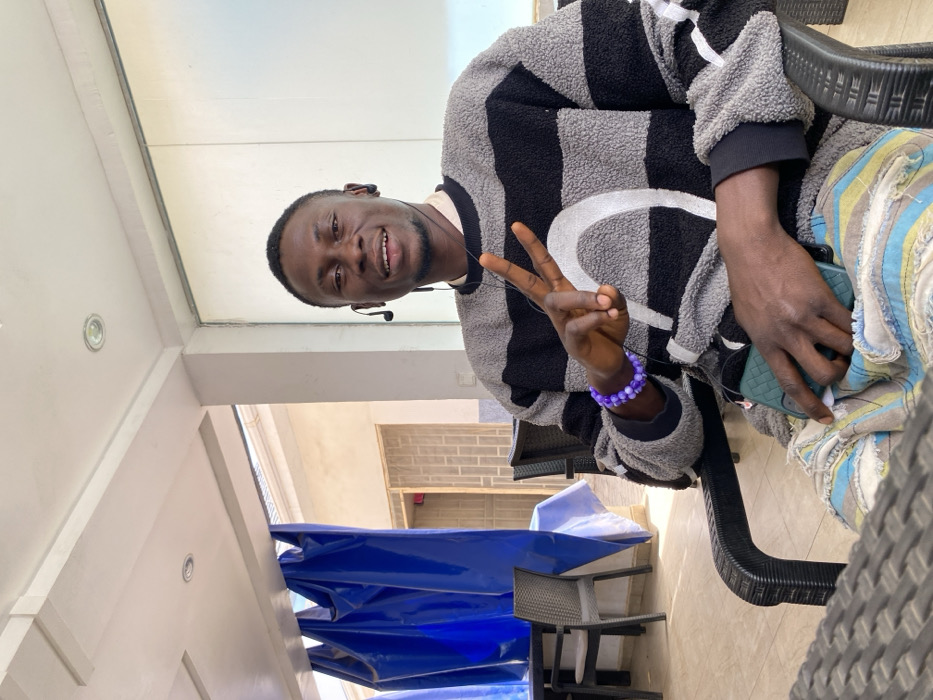 A young adult male with dark skin and short dark hair is seated, smiling and looking directly at the camera