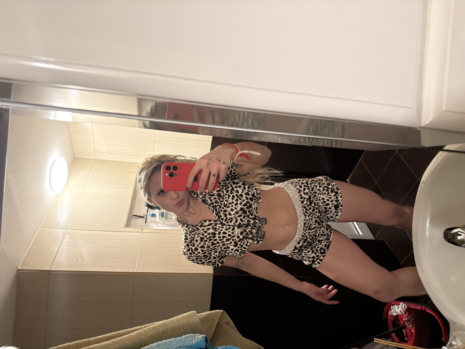 The image displays an individual taking a mirror selfie inside what appears to be a private residential bathroom. The precise location within Sofia, Bulgaria, cannot be identified from the visual data present. The subject is a female with blonde hair, possibly styled in dreadlocks or braids, holding a red smartphone in her right hand to capture the reflection. She is wearing a two-piece leopard print pajama set, comprising a short-sleeved, collared top knotted at the waist, revealing her midriff, and matching shorts with a white elastic waistband. Tattoos are visible on her left forearm and a butterfly design is on her lower abdomen. Her left wrist features several bracelets, including red and white braided ones. The bathroom's upper walls are tiled with light brown rectangular ceramic, while the lower walls and floor feature dark brown tiles. A circular ceiling light fixture is reflected above the subject. A white sink is partially visible in the foreground. To the left, a towel rack holds a light blue and a beige towel. A red bucket, possibly containing cleaning implements, is partially visible on the floor at the far left. A shower niche containing bottles is reflected behind the subject's head, and a white door or cabinet is reflected on the right side of the mirror.