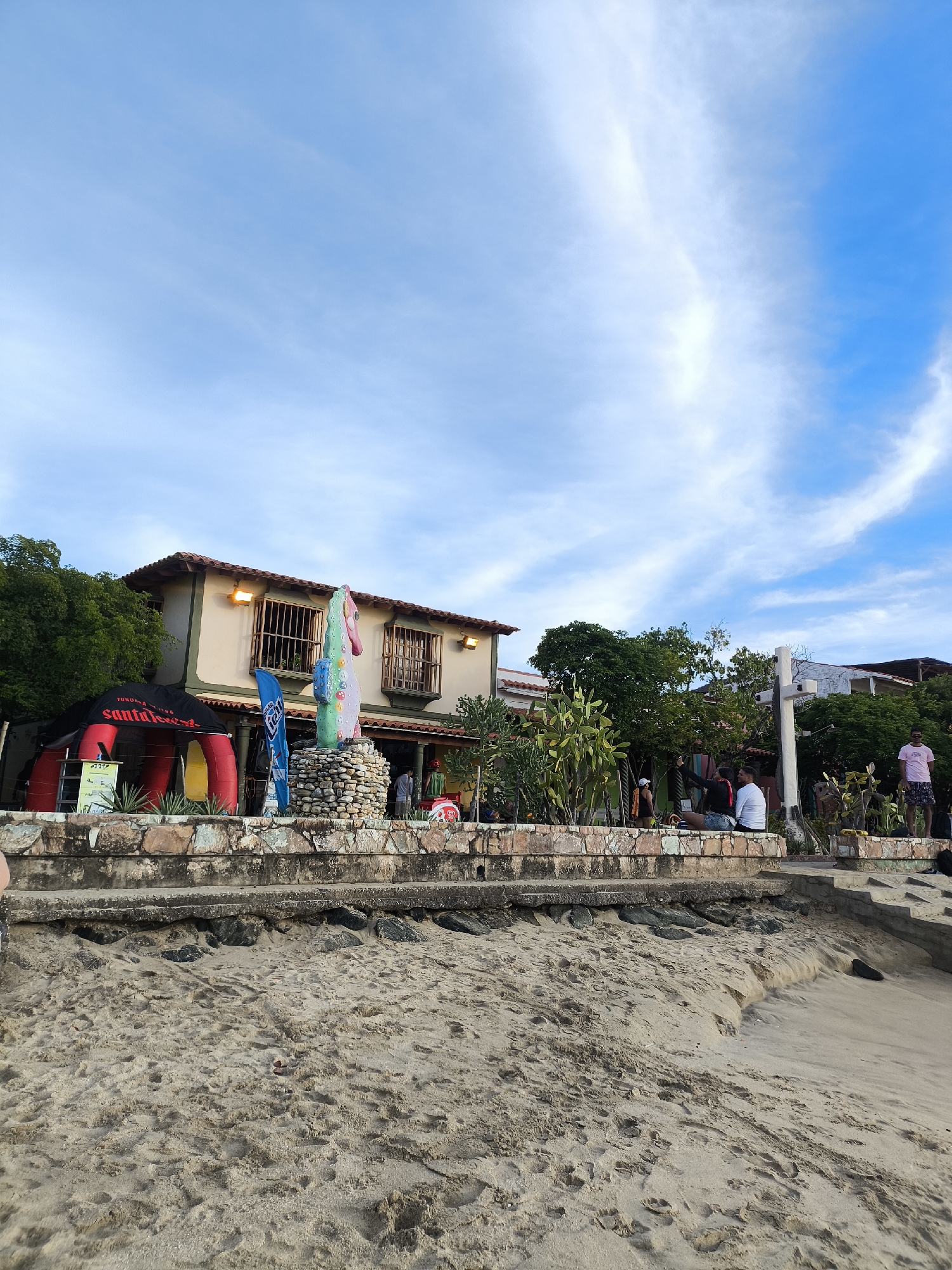beachfront scene in Pedro González, Venezuela. A sandy beach in the foreground leads to a low stone wall and raised platform. Behind the wall is a two-story building with a tan exterior and a red tile roof. The building has several windows with dark bars and an open front area suggesting a business or restaurant. A large inflatable structure is next to the building. A colorful statue stands on a rock base in front of the building. People are standing and sitting on the platform behind the stone wall. The sky is blue with scattered clouds. The vegetation includes trees, bushes, and cacti.