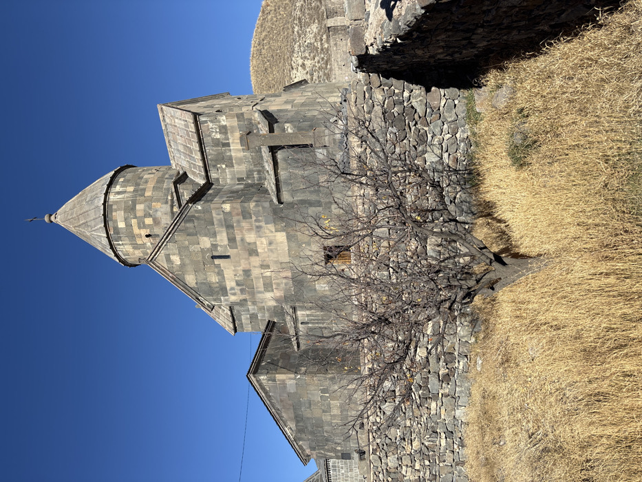 A gray stone monastery with a conical roof stands against a clear blue sky. A stone cross adorns its side. In front of the structure is a dry, leafless tree with gnarled branches. The monastery's stone wall gives way to dry, yellow grass, and a hill can be seen in the background. The image is composed with the monastery occupying a significant portion, highlighting its architectural details.