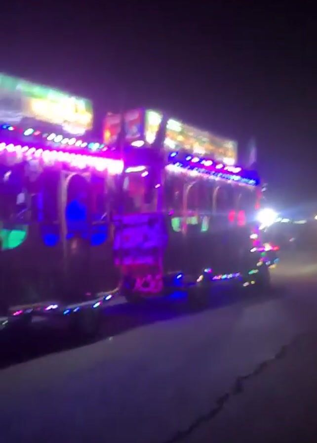 bus decorated with bright neon lights driving down a dark road at night. The bus is multi-colored, switching between green, purple, and blue hues. It is followed by a trailer, also decorated with lights. Other vehicles and some people can be seen indistinctly in the background, illuminated by the bus's lights. The road is asphalt and shows a crack running along the side.