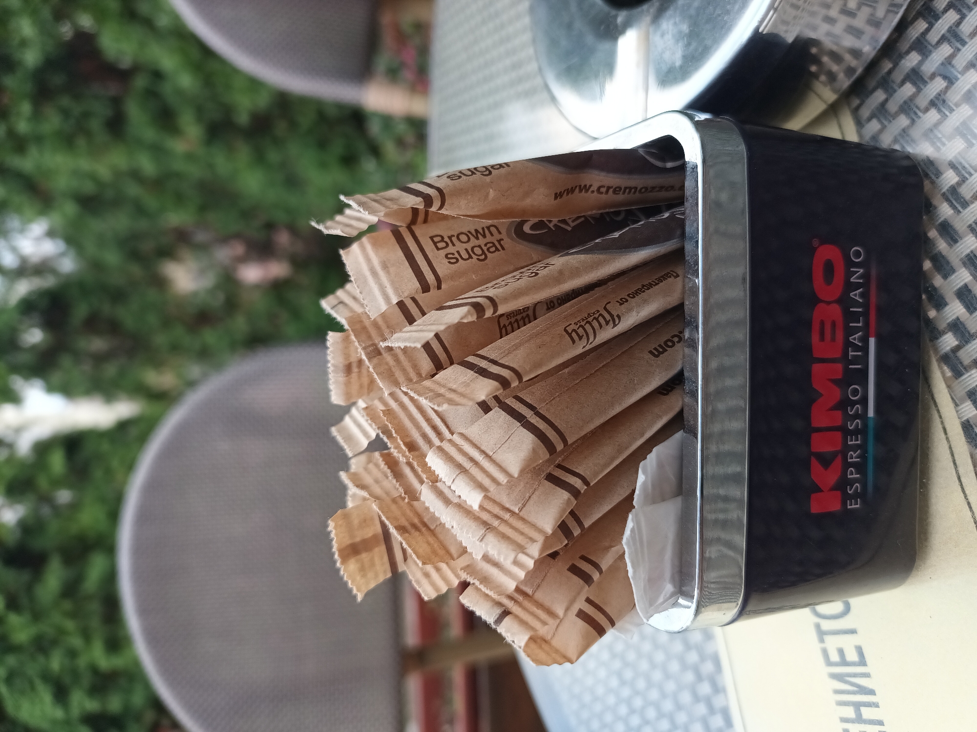 - "An overhead, slightly angled close-up image depicts a black rectangular Kimbo Espresso Italiano container filled with individual sugar packets and some white paper packets, positioned on an outdoor cafe table in Blagoevgrad, Bulgaria" by FM-MiSLx2, licensed under CC BY 4.0