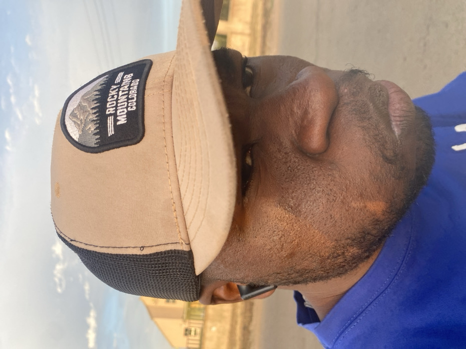 A brown-skinned man wearing a tan and black baseball cap with a "Rocky Mountain Colorado" patch is captured in a medium close-up shot. The man sports a short beard and mustache. He wears a blue collared shirt. The background features a blurry building and a cloudy sky. The photo is slightly tilted, with the man facing to the left of the frame.