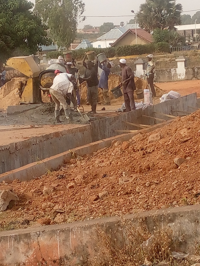 A construction scene unfolds with several workers near a yellow cement mixer. One man shovels concrete, while others carry buckets on their heads. Bags of cement are visible nearby. In the foreground, a concrete structure with mounds of dirt suggests ongoing work. Houses and trees are in the backdrop, under a slightly hazy sky.