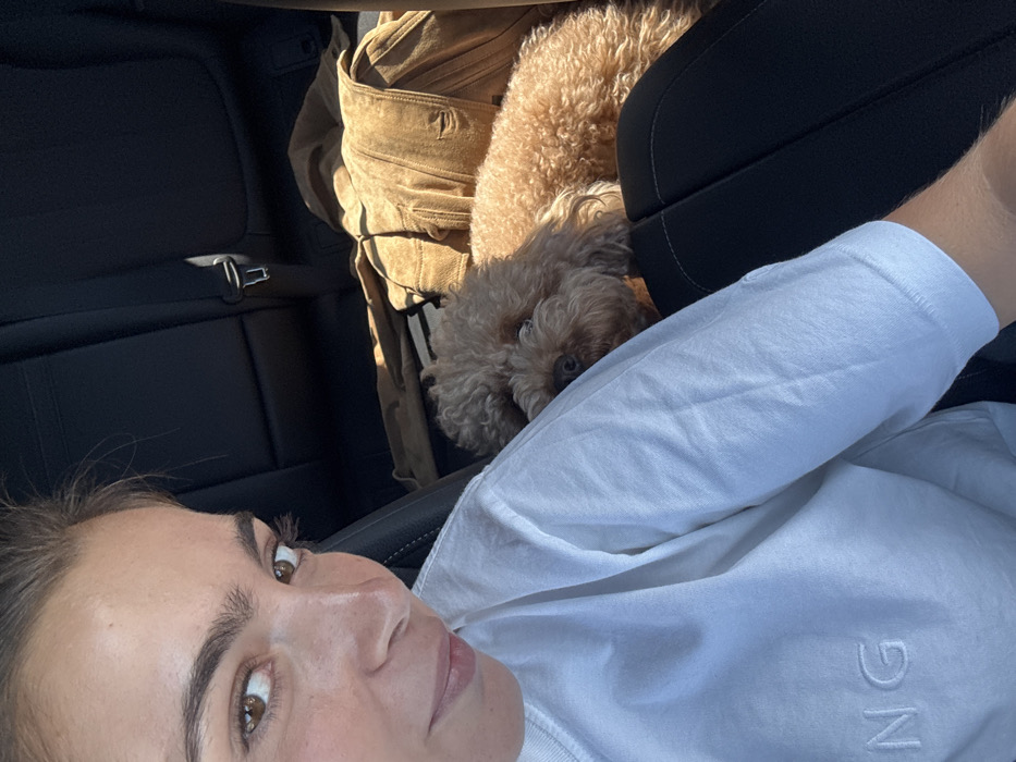 The image depicts the interior of a vehicle, featuring a female and a small dog. A light-skinned female, with dark hair and wearing a light-colored short-sleeved t-shirt with partially visible embroidered text "NG," occupies the left portion of the frame. She looks directly towards the camera, indicating a self-portrait. To her right, a medium-brown, curly-haired dog rests on a dark car seat, its head turned towards the viewer. In the background, dark car seats are visible, along with a tan-colored jacket, appearing to be suede, draped over a rear seat. A silver seatbelt buckle is observable on the upper left rear seat. The image contains no discernible information that identifies its location as being in the city of Pombal, Portugal.
