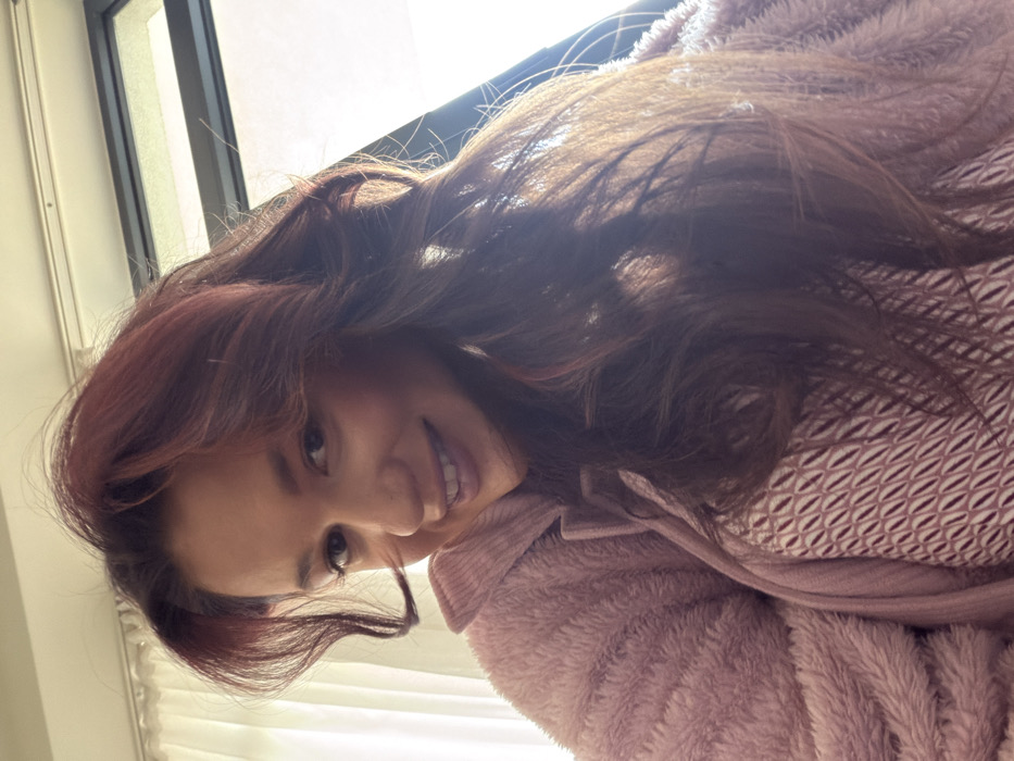 A close-up, waist-up portrait captures a smiling female with long, wavy, reddish-brown hair
