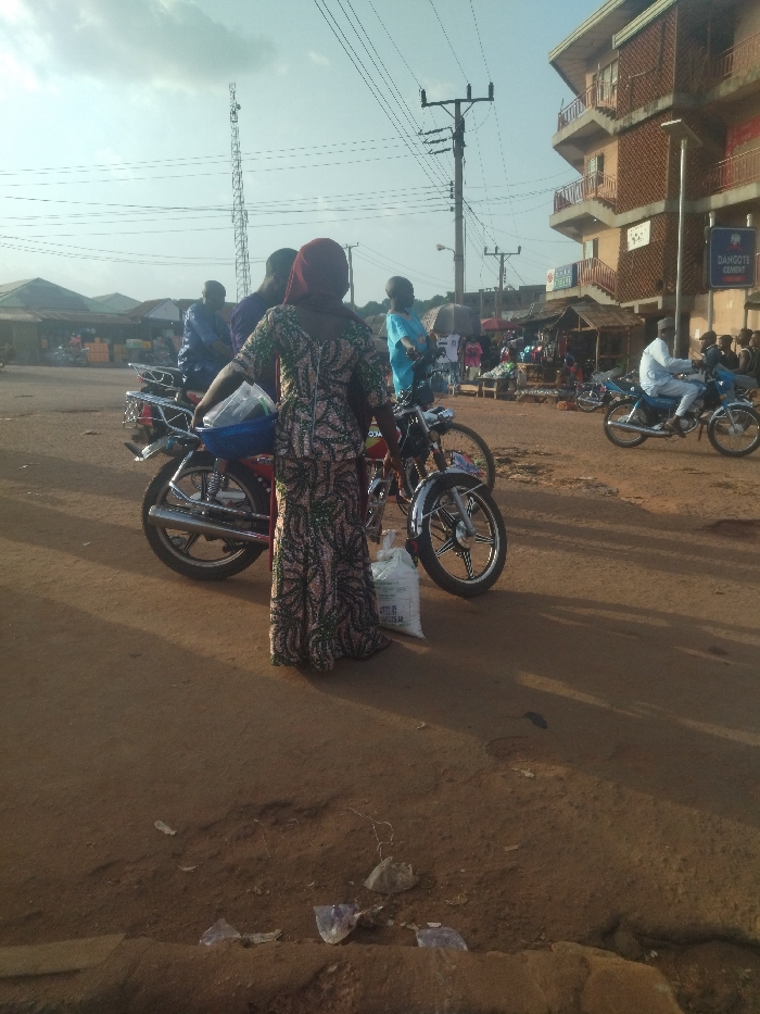 street scene in Lukoja, Nigeria, at latitude 7.404 and longitude 7.632. There are several people, including a woman in a long floral dress and headscarf, standing in front of a motorcycle. The woman is holding a plastic bag. There is also a man standing in front of the motorcycle, who is wearing a blue shirt and a hat. There are other people in the background, walking on the street. Several motorcycles are parked on the street. The scene is set in a street with a building on the right, and several power lines are strung across the street. The street surface is dirt and dust, and there are some small rocks on the ground. There are also a few small pieces of debris on the street. The sky is partially cloudy and the sun is setting.