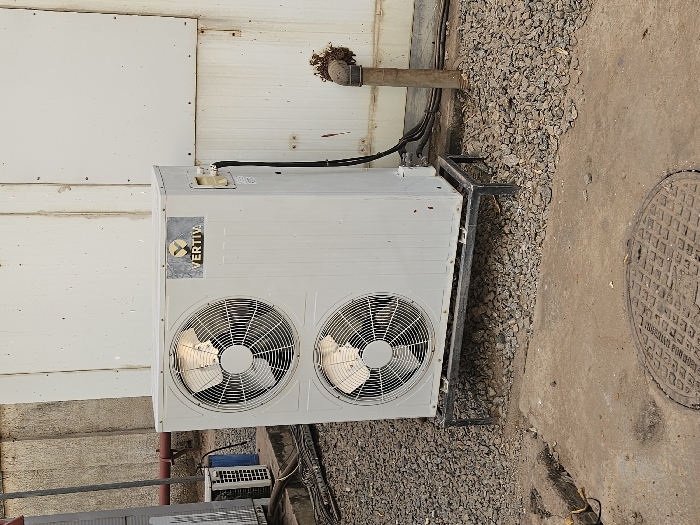 A dual-fan Vertiv air conditioning unit rests on a metal frame against a white wall