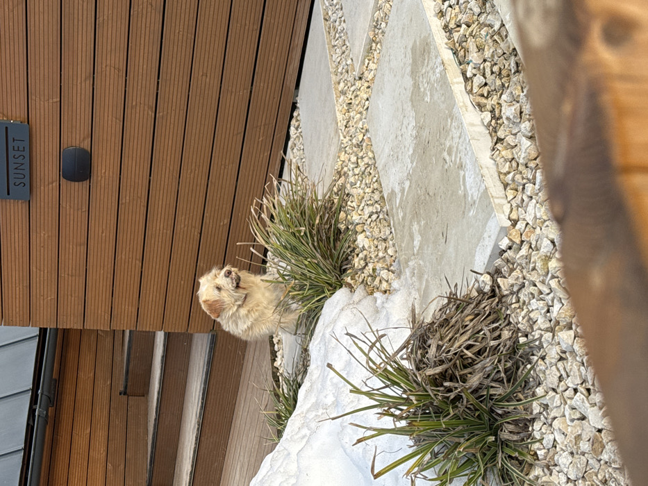 The image depicts an outdoor scene in Căciulați, Romania. A medium-sized, light-brown and white shaggy-haired dog stands in the midground, facing slightly right with its mouth partially open. It is positioned on a ground surface composed of light-colored gravel interspersed with square concrete stepping stones. Patches of melting snow are visible on the ground, particularly around clumps of ornamental grass-like plants, some green and others dried. In the background, a building features horizontal wooden plank siding in a reddish-brown hue. A black rectangular sign with white text reading "SUNSET" is affixed to the siding, above a black circular outdoor light fixture. Partially visible to the left of the dog are a few wooden steps leading upwards. The lower right foreground shows a blurred, dark wooden surface, possibly a railing. The scene is illuminated by natural light, suggesting daylight.
