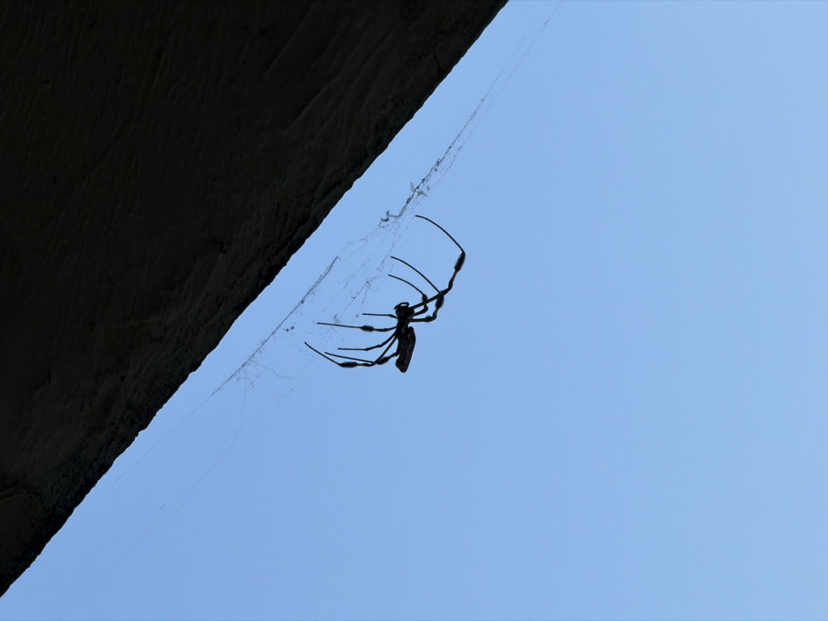 - "Against a light blue sky, a silhouetted golden orb-weaver spider dangles from its web connected to a dark, shadowed ledge above" by FM-Ft7F82, licensed under CC BY 4.0