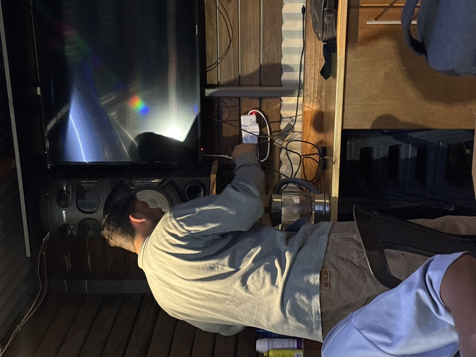 The image depicts an indoor or covered outdoor utility area located in the City of Chadwick, Australia. The central figure is a male, viewed from the back and left side, wearing a light grey long-sleeved shirt and brown work pants with an "M.T.D." patch on the right rear pocket area. His right hand is actively engaged with a white multi-outlet power board mounted on a horizontally slatted wooden wall, which has multiple black electrical cables connected. To the male's left, on a light-colored wooden countertop, a silver and black electric kettle is present. To his right, a large black Panasonic television screen is mounted above the countertop, displaying reflections of a blue LED strip light and a rainbow-colored spectral effect. A tall black Sony speaker is positioned to the left of the television. Below the countertop, to the right of the kettle, several dark-colored chairs are stacked. Further right, under the countertop, wooden cabinet doors are visible. On the far left, two aerosol cans are seen. A black bag rests on the far right of the countertop. A portion of a second individual, wearing a light blue/grey shirt, is visible in the lower left foreground, seated on a black chair. Overhead, dark structural beams and electrical wiring are visible.