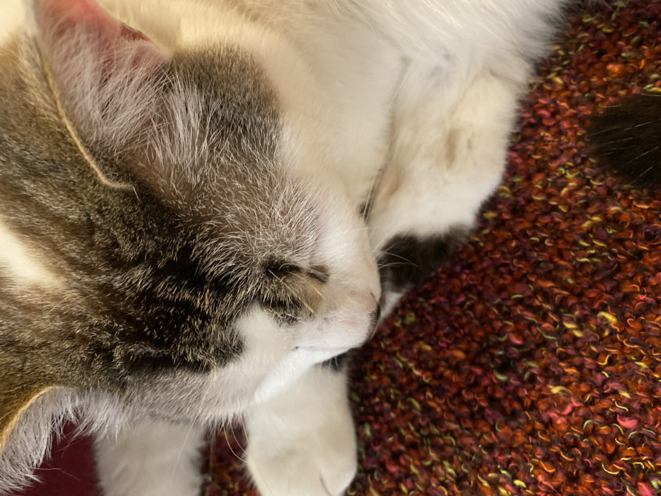 A close-up, high-angle image depicts a domestic feline, specifically a cat, resting within an indoor residential setting in Cucuron, France. The cat exhibits a white and tabby coat pattern, characterized by white fur on its lower face, a visible front paw, and parts of its body, contrasted with patterned dark grey and brown tabby markings on its head and ears. A distinct dark spot is present near the left nostril, with another smaller dark marking on the chin. The cat's head is lowered and its eyes are closed, indicating sleep or deep rest. Its front paws are tucked close to its body, with one white paw visible in the lower left portion of the frame. The feline is positioned on a textured textile surface, which displays a variegated color palette dominated by shades of red, orange, and yellow, interspersed with hints of green and purple, creating a nubbly or boucle-like texture. The lighting is soft and consistent, suggesting an ambient indoor environment. The image focuses sharply on the cat's head and the immediate textile, utilizing a shallow depth of field.