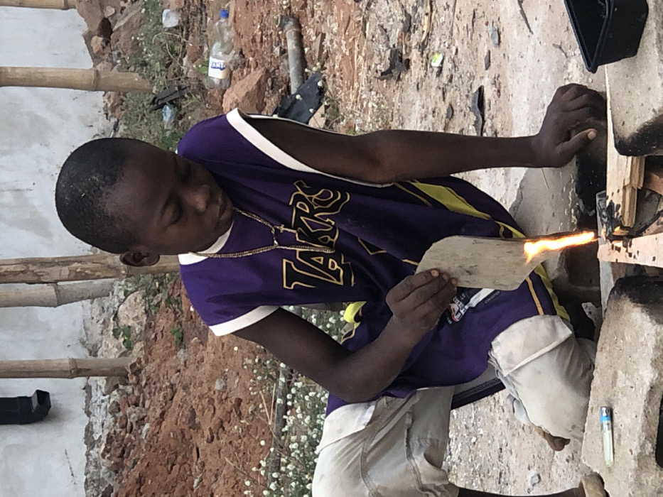 In Enugwu-Ukwu, Nigeria, a young Black male, appearing to be a child, is depicted outdoors in a crouching or kneeling position. He wears a purple sleeveless basketball jersey with "LAKERS" written in yellow text, and light-colored shorts. A gold-colored chain with a cross pendant hangs around his neck. His gaze is directed downwards, focused on an activity involving fire. He holds a flat, light-colored wooden paddle-like object in his right hand, positioned above a small, contained fire. A bright orange-yellow flame is visible, emanating from the underside of the wooden object and directing heat towards a dark, possibly melting substance resting on small pieces of wood. This setup is supported by two rough concrete blocks or bricks. A translucent blue and white disposable lighter rests on the left concrete block. To the right of the heating arrangement, a black rectangular container is visible on the ground. The immediate ground is composed of reddish-brown dirt with patches of small white flowering plants and green foliage. In the mid-ground, discarded items such as a clear plastic water bottle, a dark object, and a metal pipe segment are present. The background features a light-colored wall with a black PVC drainage pipe on the left, and several vertical natural wooden poles or bamboo stalks on the right.