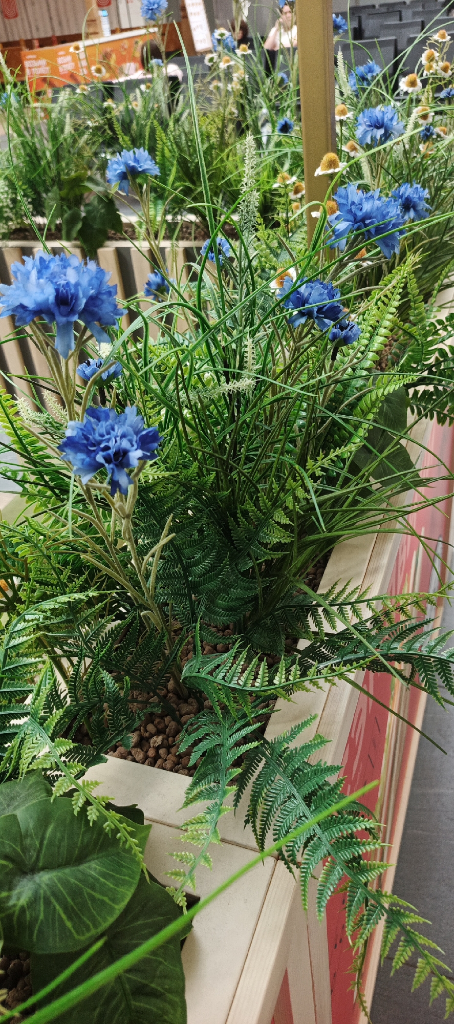 The scene depicts a static artificial plant display situated within an indoor public environment in Bolshoye Savino, Russia. In the foreground, a light-colored wooden planter box holds a dense arrangement of artificial foliage and blossoms. Prominently featured are numerous vibrant blue artificial cornflower-like flowers, interspersed with smaller white and yellow artificial daisy-like flowers. The greenery consists of various types, including long, thin grass-like blades and broad fern fronds. The visible substrate within the planter comprises small, reddish-brown spherical pellets. The side of the planter exhibits a light-colored wooden slat design. The background, largely out of focus, reveals elements of an indoor space, including what appears to be a retail counter or food stall with orange signage, a vertical golden-brown pole, and the upper torso of an indistinct person wearing a light-colored top. A red surface with a subtle geometric pattern is visible along the right edge of the image, immediately adjacent to the planter. No specific actions or interactions are occurring.