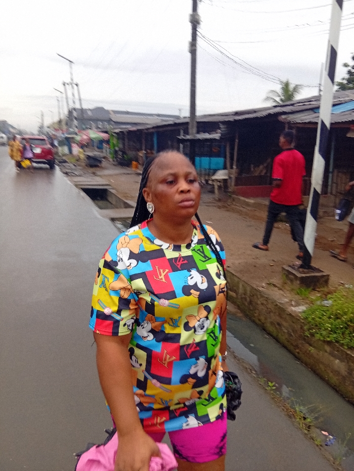 This image depicts a street scene in Aba, Nigeria, under an overcast sky. In the foreground, a woman of medium complexion walks forward, slightly to the left of the frame's center. She has short, dark braided hair with a shaved part on the right side of her head and wears large, ornate silver-colored earrings. Her attire consists of a short-sleeved, brightly colored t-shirt featuring a checkered pattern of Mickey Mouse faces and "LV" logos in various colors (red, blue, yellow, green, black). She wears hot pink biker shorts or leggings beneath. Her left arm is by her side, partially obscuring a small black bag or pouch. In her right hand, she holds a crumpled piece of pink fabric. Her gaze is directed forward. The woman walks on a wet asphalt road, indicating recent precipitation. To her right, an open concrete gutter runs parallel to the road, containing murky water and some debris. Beyond the gutter, a narrow, unpaved strip of ground with sparse green vegetation precedes a row of single-story structures. These appear to be shops or stalls with corrugated metal roofs, some painted in shades of blue, green, or brown, showing signs of wear. In the mid-ground on the right, a man in a red t-shirt and dark pants walks away from the viewer, positioned near a black and white striped utility pole. Several other utility poles with overhead wires are visible along the street, receding into the distance. On the far left, a red vehicle is visible on the road, with indistinct figures nearby. A palm tree is partially visible above the structures on the right side in the background.