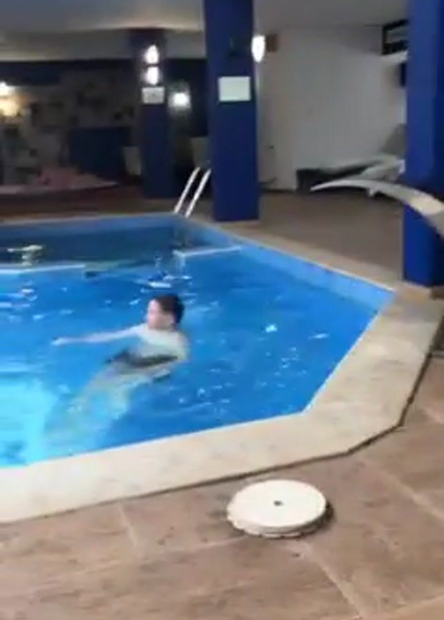 A boy is swimming in an indoor pool. The pool is surrounded by brown tile. The walls are blue and there is a waterfall feature on one side. There are lounge chairs in the background.