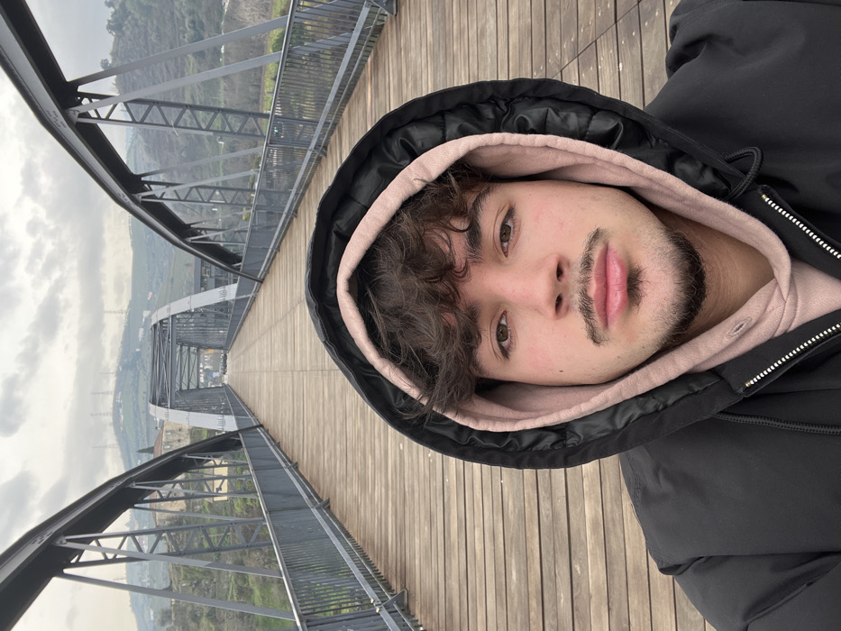A young male individual, appearing to be in his late teens or early twenties, takes a selfie on the Ponte Rodoviária da Régua bridge in Peso da Régua, Portugal