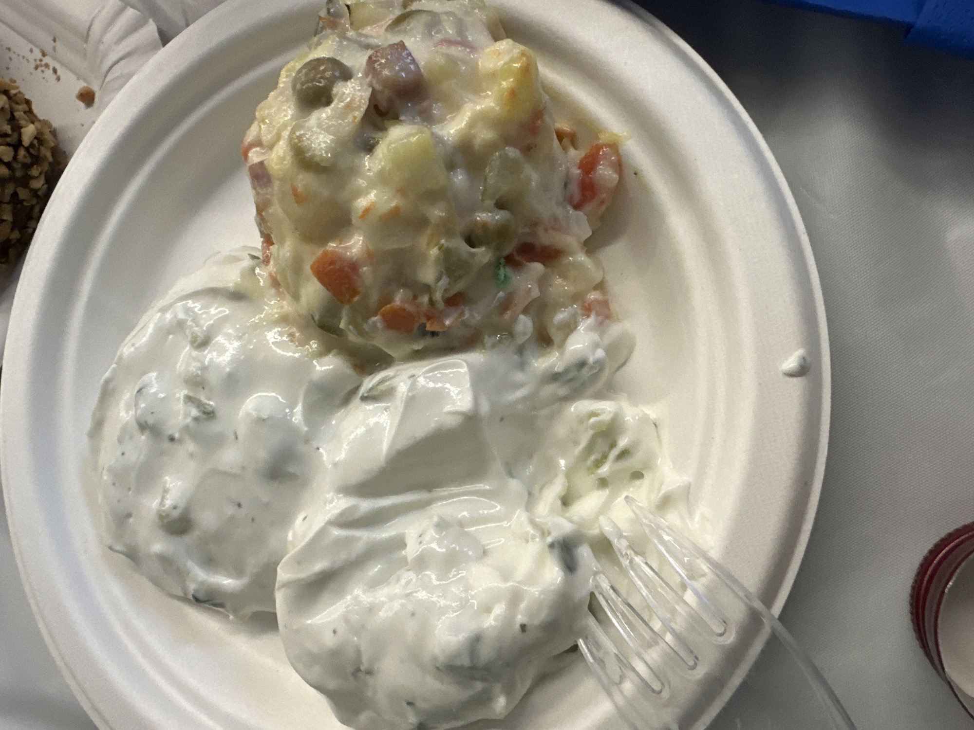 A top-down shot shows a white paper plate on a light-colored surface. On the plate is a mound of potato salad, recognizable by the mix of potatoes, carrots, peas, and other vegetables in a creamy dressing. Next to it is a generous dollop of what appears to be tzatziki sauce or a similar creamy dip with visible herbs. A clear plastic fork is partly submerged in the tzatziki. In the periphery, there is a nut-covered ball to the left of the plate, and a jar lid in the lower right. The photo was likely taken at a food stall or event, although the specific location in Trier, Germany, is unknown from the given image.