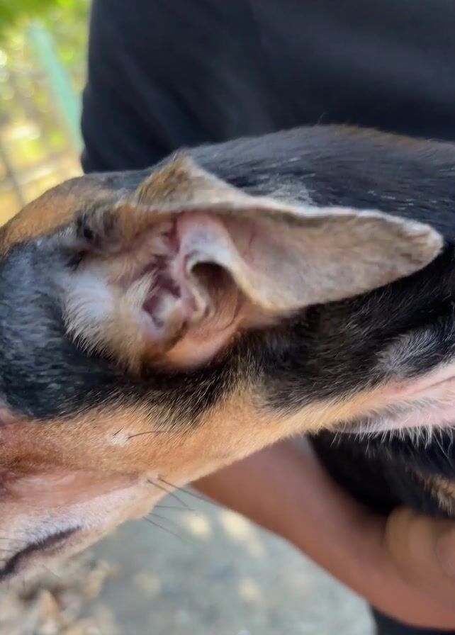 A person wearing a black shirt holds a small, tri-color dog in their arms. The dog is mostly black and tan, with some white patches on its chest. The camera focuses closely on the dog's head, showing its ears and eyes in detail. The background includes a blurred view of greenery, a fence, and a paved path. The dog is very small and appears to be looking away from the camera.