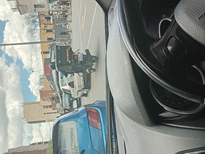 The image displays an urban street scene in Germiston, Gauteng Province, South Africa, captured from the interior of a vehicle. The immediate foreground shows a black, textured dashboard and the upper right portion of a black steering wheel, with a speedometer dial partially visible behind it indicating a low speed or RPM. Directly ahead, in the midground, a light blue "Savvy" hatchback is observed, oriented away from the camera. Its rear window features a white decal with the text "PLUMBER" and "G & PROPERTY," a crest-like logo, and the partial numeric sequence "232." To the right of the hatchback, a person wearing a dark helmet and dark clothing is operating a black motorcycle. The motorcycle has a large black delivery box mounted on its rear, adorned with orange reflective tape. The motorcycle's license plate clearly displays "MH9 0MWGP." Directly in front of the motorcycle is a light-colored sedan, followed by a darker-colored sedan. The asphalt road surface visible includes yellow painted lane markings and directional arrows. The background presents a typical urban environment with multiple multi-story buildings lining the street. A prominent, tall, light-colored building with a flat roof is situated on the left. Further down the street, an intersection is visible with traffic lights, one of which appears to be red. A street light pole is present on the right side of the road. Pedestrians are observable on the sidewalks to the right. The sky is partly cloudy with a mix of white clouds and blue sky.