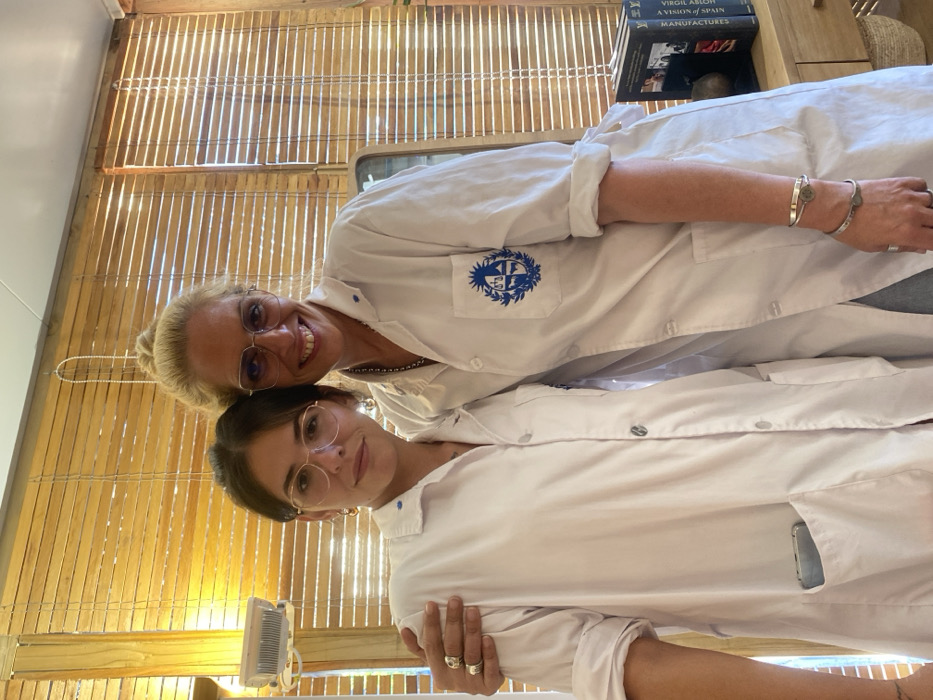 Two women wearing white lab coats pose indoors, possibly a medical or research setting. The older woman, with blonde hair and glasses, stands behind the younger woman, who also wears glasses. Both are smiling. The lab coats have a blue insignia on the chest. Behind them is a bamboo-like screen. Stacks of books are visible on a shelf in the background. The younger woman has her arm around the older woman, and a cell phone is visible in her pocket.