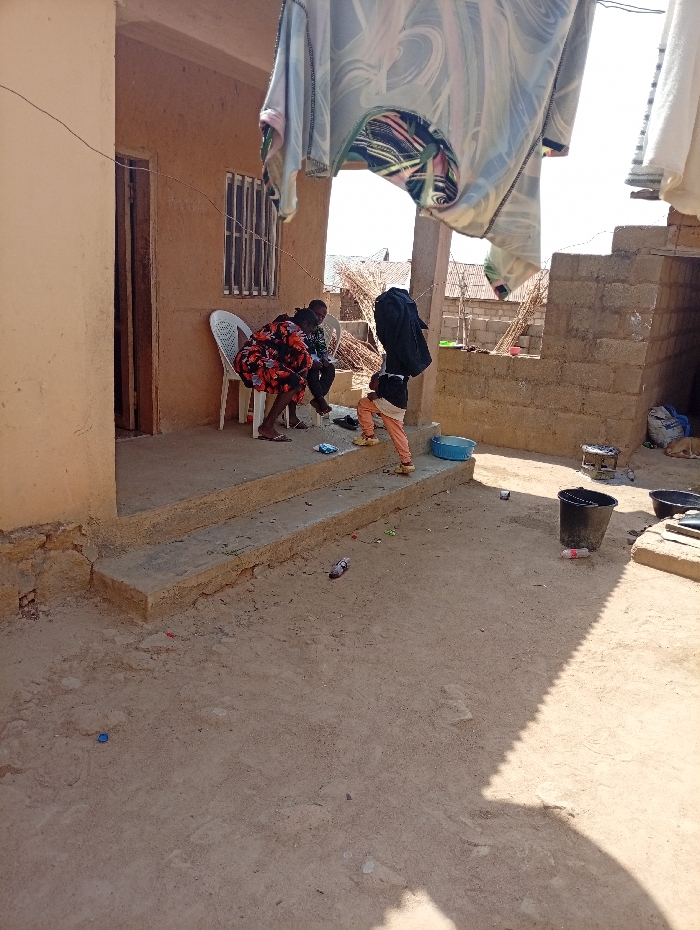 An outdoor scene in Barikin Gidar Kanat, Nigeria, depicts three individuals within a dusty, sunlit residential compound