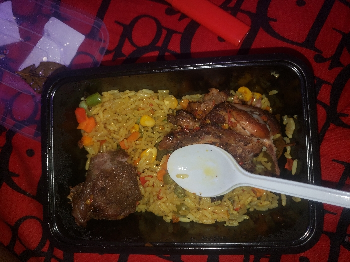 The scene depicts a close-up, top-down view of a meal in a black rectangular takeout container, positioned on a red fabric with a repeating dark pattern. The location is Okpanam, Nigeria. The container holds yellow-tinted rice mixed with various vegetables, including red bell pepper pieces, green beans, and corn kernels. Several pieces of dark-brown, cooked meat are distributed over the rice, appearing to be both chicken and a denser cut of beef. A white plastic spoon rests on the food, oriented diagonally from the lower right to the upper left. In the upper left corner, part of a clear plastic container lid is visible, containing a small, dark, irregular object. A red cylindrical object lies in the upper right corner of the frame. No individuals are present.