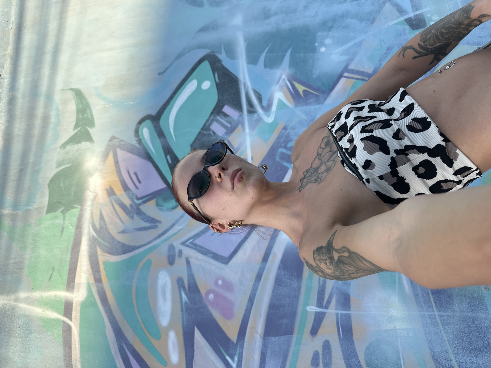 woman posing in front of a graffiti wall. The graffiti is brightly colored, with shades of blue, purple, and green. The woman is wearing sunglasses and a black and white patterned swimsuit. She has tattoos on her arms and chest. The image appears to have been taken at an angle, possibly as a selfie. There are no other identifiable details to suggest the location is specifically in Tibubeneng, Indonesia.