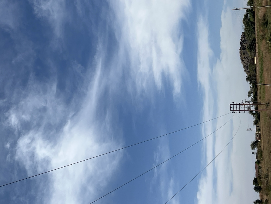 The image depicts a semi-rural landscape under a blue sky with scattered white cirrus and cumuliform clouds