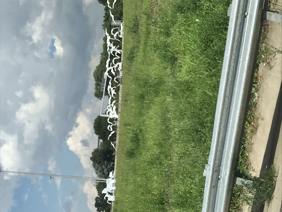 The image displays a roadside scene in Germiston, South Africa, under a partly cloudy sky. In the foreground, a silver metal guardrail is present, running horizontally across the bottom of the frame, above a concrete curb and sparse ground vegetation. Beyond the guardrail, a broad expanse of unmanicured green grass, dotted with small purple wildflowers, occupies the midground. In the background, on an elevated grassy verge, several white silhouette sculptures are visible. These include a large zebra standing beside a smaller zebra figure on the left. To their right, a dense arrangement of numerous white bird silhouettes in various flight postures extends along the verge. Behind these sculptures, a multi-lane roadway is visible, populated with moving vehicles, including several white cars. An overhead gantry sign structure spans the road. The far background features a treeline and indistinct urban structures. A tall, slender light or utility pole is situated on the left side of the background.