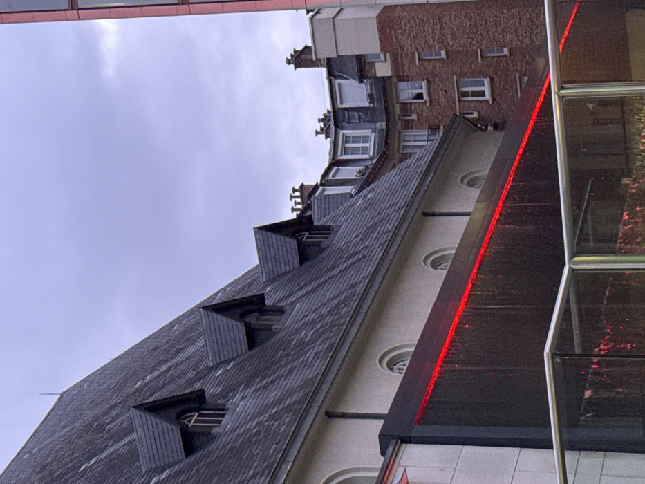 The image depicts an urban architectural scene in Puteaux, France, under conditions of low ambient light suggesting dusk or twilight. In the immediate foreground, a glass and metal railing structure is visible. Behind it, a black vertical panel functions as a water feature, with water flowing downwards, illuminated by a prominent horizontal red light strip integrated into its top edge. This red light reflects on the water's surface and the foreground railing. This illuminated water feature is situated against a large, light-colored building exhibiting a steep, dark grey slate roof with three visible dark-framed dormer windows, each featuring an arched top. The facade of this building, partially obscured, is pierced by multiple arched windows. To the right and behind this primary structure, a red brick building with several rectangular windows is visible. Above and adjacent to the brick building, another building with a grey pitched roof, multiple dormer windows, and several chimney stacks is present, characteristic of traditional urban French architecture. On the far right edge of the image, a vertical section of a modern building with a distinct red architectural element is visible. The sky overhead is overcast, displaying a muted blue-grey tone. No individuals are present in the scene.