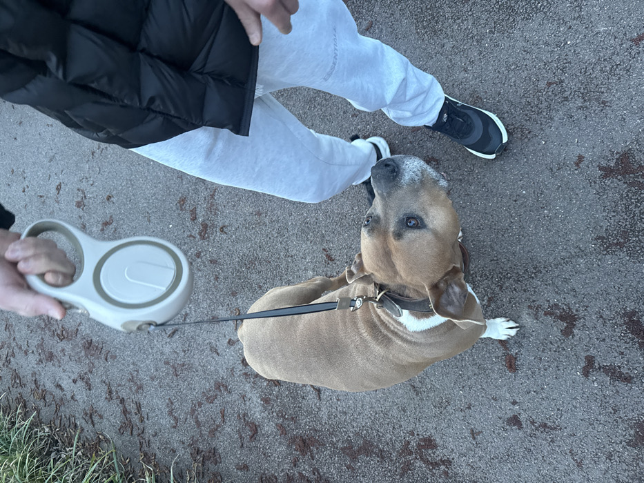 - "A tan dog with a white chest and graying face is leashed" by FM-OZmdD3, licensed under CC BY 4.0