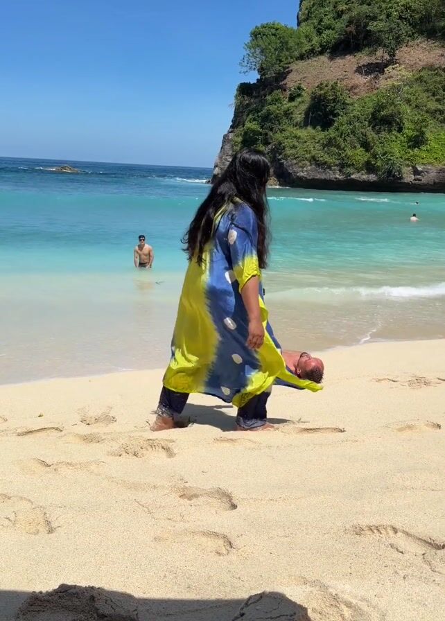 A woman in a yellow and blue dress walks across a sandy beach on a bright, sunny day. The water is clear and turquoise, with small waves breaking on the shore. A man is lying on the sand sunbathing near the water’s edge. There is a small, green, cliffy island in the background. Other people are visible in the water. The woman walks past the man.