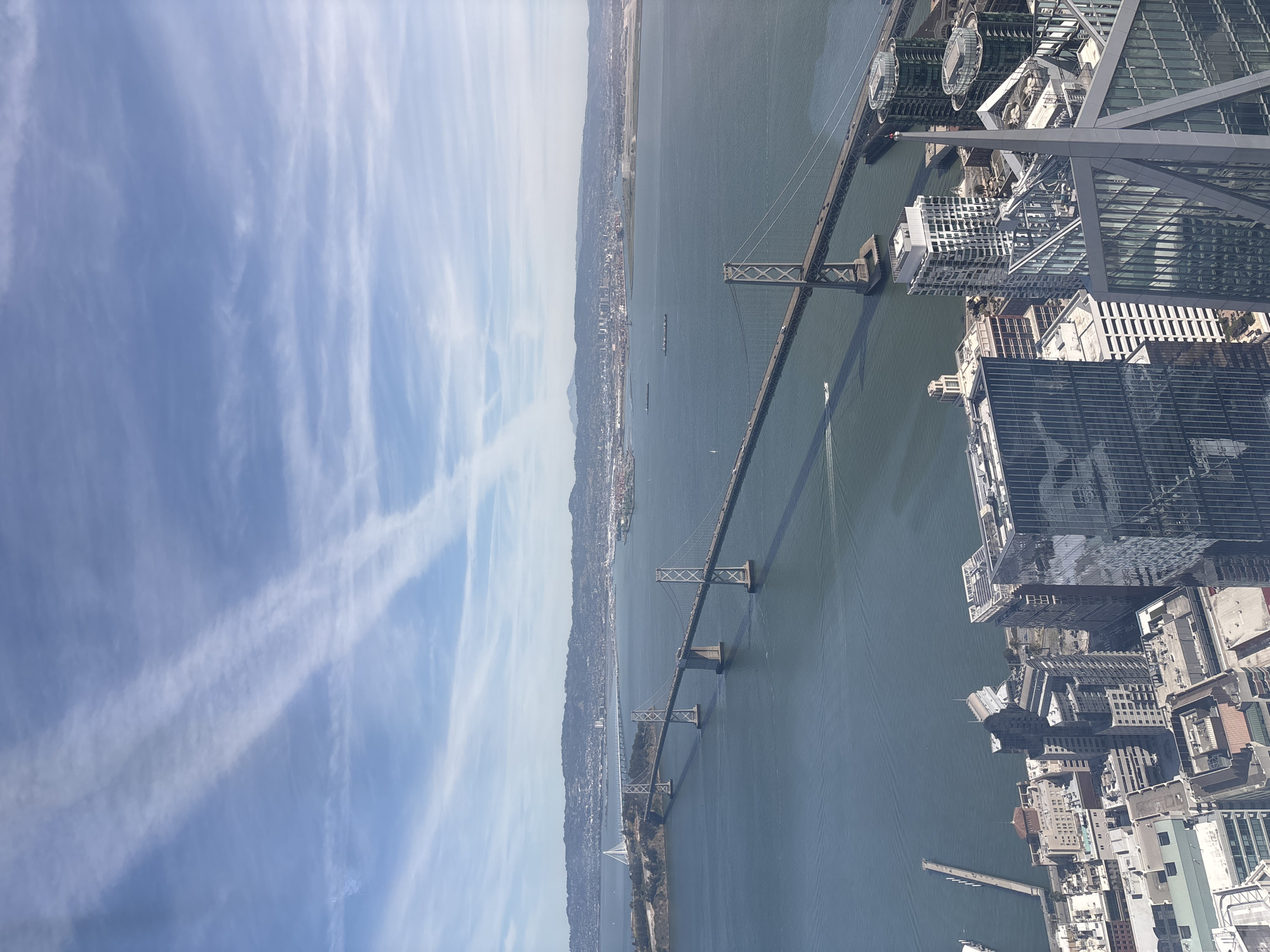 This image presents a high-angle aerial view looking east over the San Francisco Bay, originating from a tall building in downtown San Francisco, California, United States of America. The prominent subject is the San Francisco-Oakland Bay Bridge, extending across the bay from the foreground towards the distant East Bay shoreline. The western suspension spans of the bridge are clearly visible, supported by large concrete towers with X-shaped truss elements. Vehicle traffic is present on the bridge decks. Further east, the newer self-anchored suspension span is visible, connecting to Yerba Buena Island, which is positioned beneath the bridge. The San Francisco Bay occupies the midground, with dark blue-green water showing subtle ripples and reflections. A small white speedboat creates a distinct wake in the lower midground, moving generally east. A white sailboat is visible further east, and several larger dark vessels, possibly cargo ships or barges, are anchored or moving in the distant waters. A pier extends into the bay from the San Francisco coastline in the lower left. In the foreground, a dense cluster of urban high-rise buildings characterizes downtown San Francisco. Several modern glass-fronted skyscrapers reflect the sky and surrounding structures. The angular, grey architectural elements and spire of a prominent high-rise building are visible in the lower right, partially framing the view. The background features the East Bay cities and their industrial areas, with a range of hills stretching across the horizon under a pale blue sky. The sky itself is marked by several distinct, linear white contrails, indicating aircraft activity, along with diffuse wisps of cirrus clouds. No individual people are discernible in the scene.